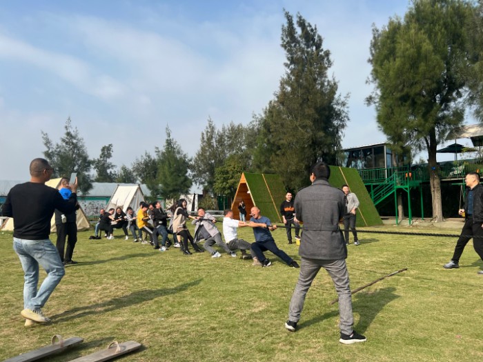 天翁作美,一大早陽光滿溢,在一聲聲加油吶喊中我們開始了本次團建活動的第一個項目,選手們緊緊地抓住繩子,個個弓著腿,身子向后倒,有節(jié)奏地喊著:拉!拉!拉!